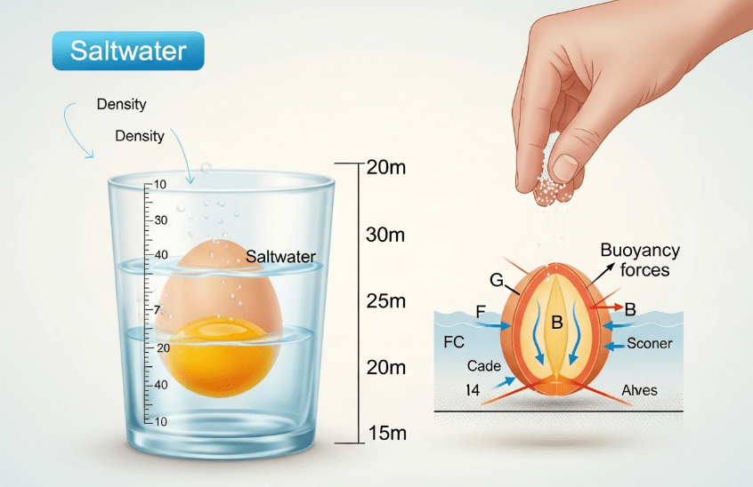 Ketika air menjadi lebih padat karena larutan garam, lebih banyak fluida yang dipindahkan oleh volume benda, sehingga gaya apung meningkat. Ketika gaya apung > gaya gravitasi yang menarik telur ke bawah, telur akan naik ke permukaan dan mengapung.